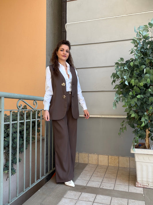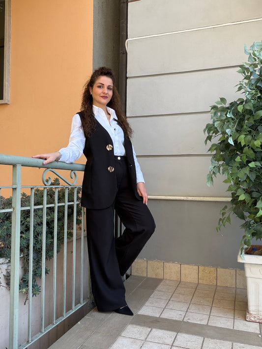 Coordinato 2 pezzi che comprende : Gilet lungo con dettaglio bottoni dorati come apertura sul...