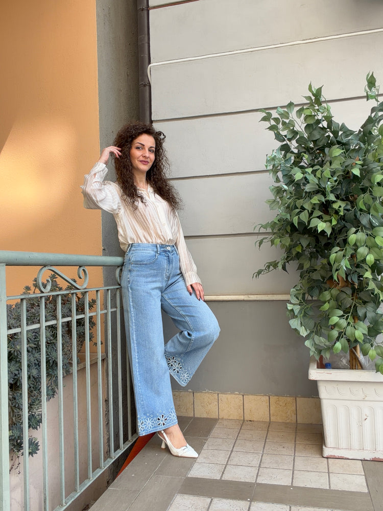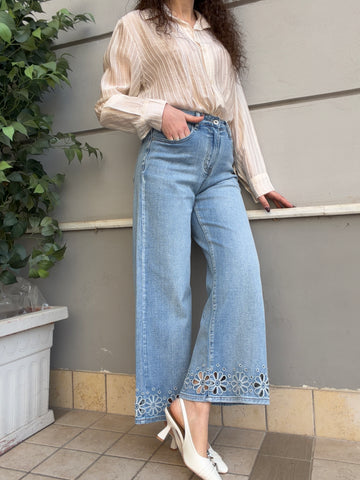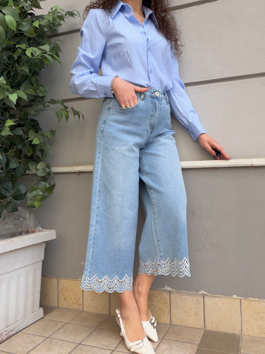 Jeans modello Capri con dettagli brillantini applicati sul fondo Gamba larga, vita alta, tasche frontali...