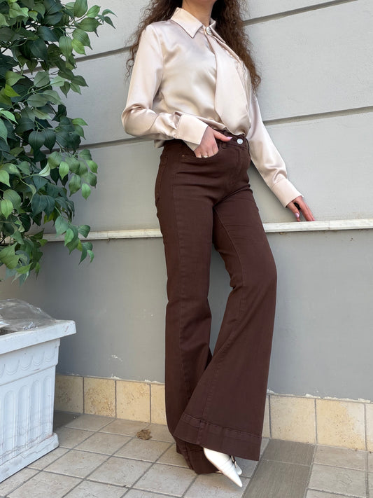 Jeans a zampa marrone effetto push-up,passanti per cintura,tasche frontali con dettaglio catena applicata. La persona...