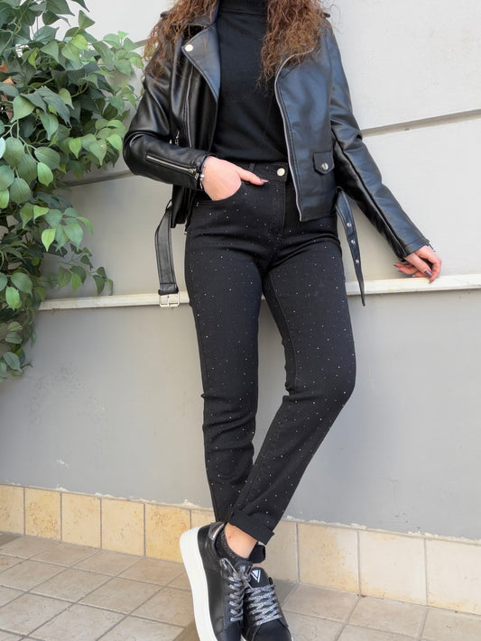 Jeans da donna Nero modello mom fit vita alta ricoperto di brillantini sia sulla parte...