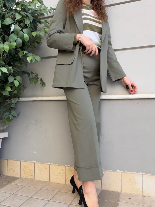 Pantalone gamba larga verde militare con fascia elastica in vita, dettaglio risvolto sul fondo cucito....