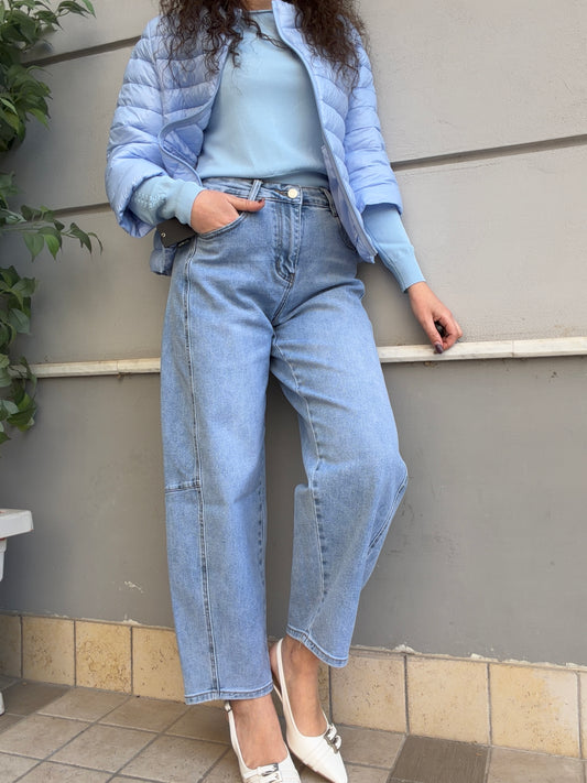 Jeans gamba larga a vita alta modello capri.Chiusura con cerniera e bottone metallico. Passanti per...