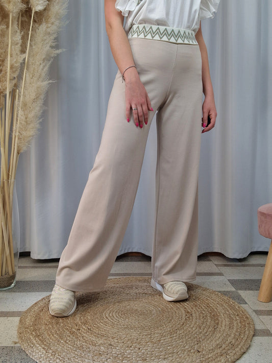 Pantalone gamba larga marrone con fascia elastica in vita, dettaglio risvolto cucito sul fondo. La...