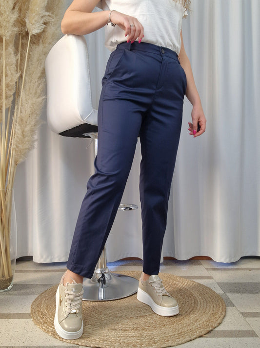 Pantalone a sigaretta con elastico sul retro. Chiusura con cerniera e bottone. Passanti in vita...