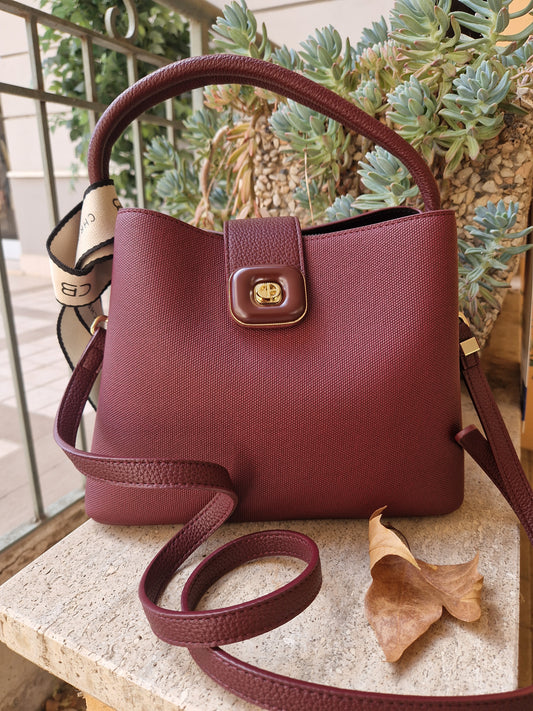 Bauletto con tracolla regolabile, tasche interne con zip, chiusura frontale con bottone clip
