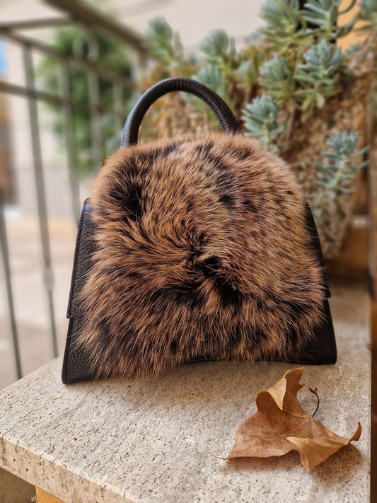 Borsetta in vera pelle con ecopelliccia applicata sul davanti (non removibile). Chiusura frontale con bottoni...