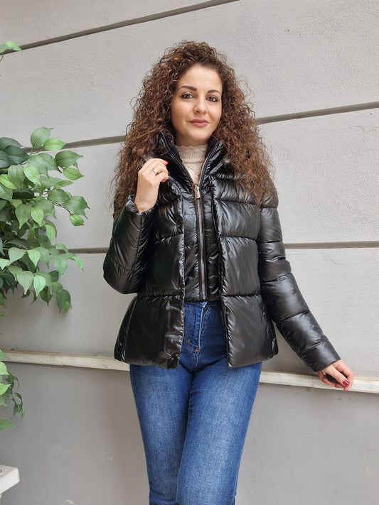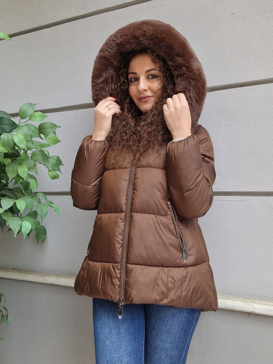 Giubbino donna trapuntato con cappuccio ed ecopelliccia folta tono su tono.Chiusura con zip, tasche frontali....