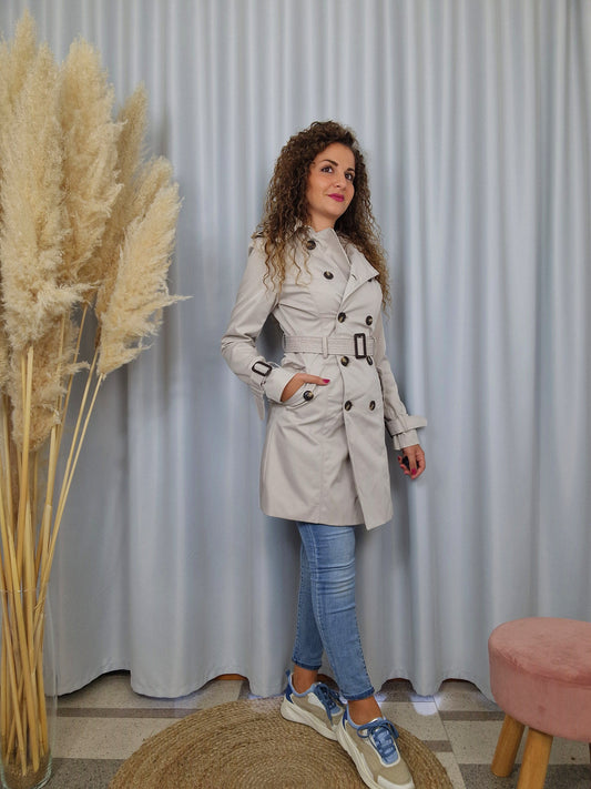 Trench da donna in tinta unita. Chiusura con bottoni doppiopetto e cintura regolabile in vita....