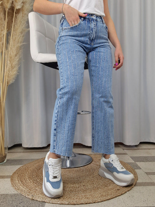 Jeans modello gamba larga ricoperto di brillantini in 3d solo sul fondo,dietro lisci,passanti per cintura...
