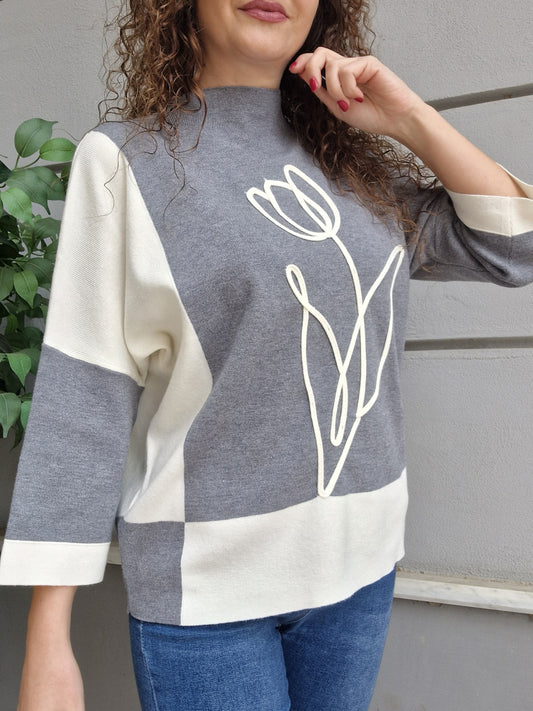 Morbidissimo maglioncino bicolore, dettagli in 3d sulla manica, Manica lunga. La persona in foto è...