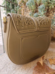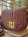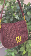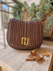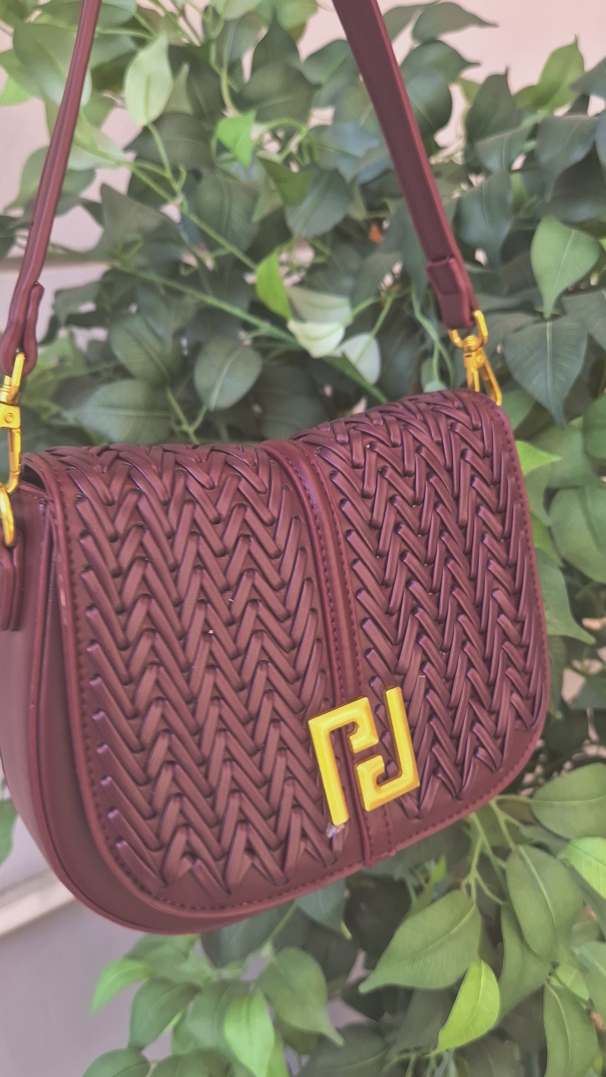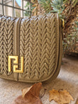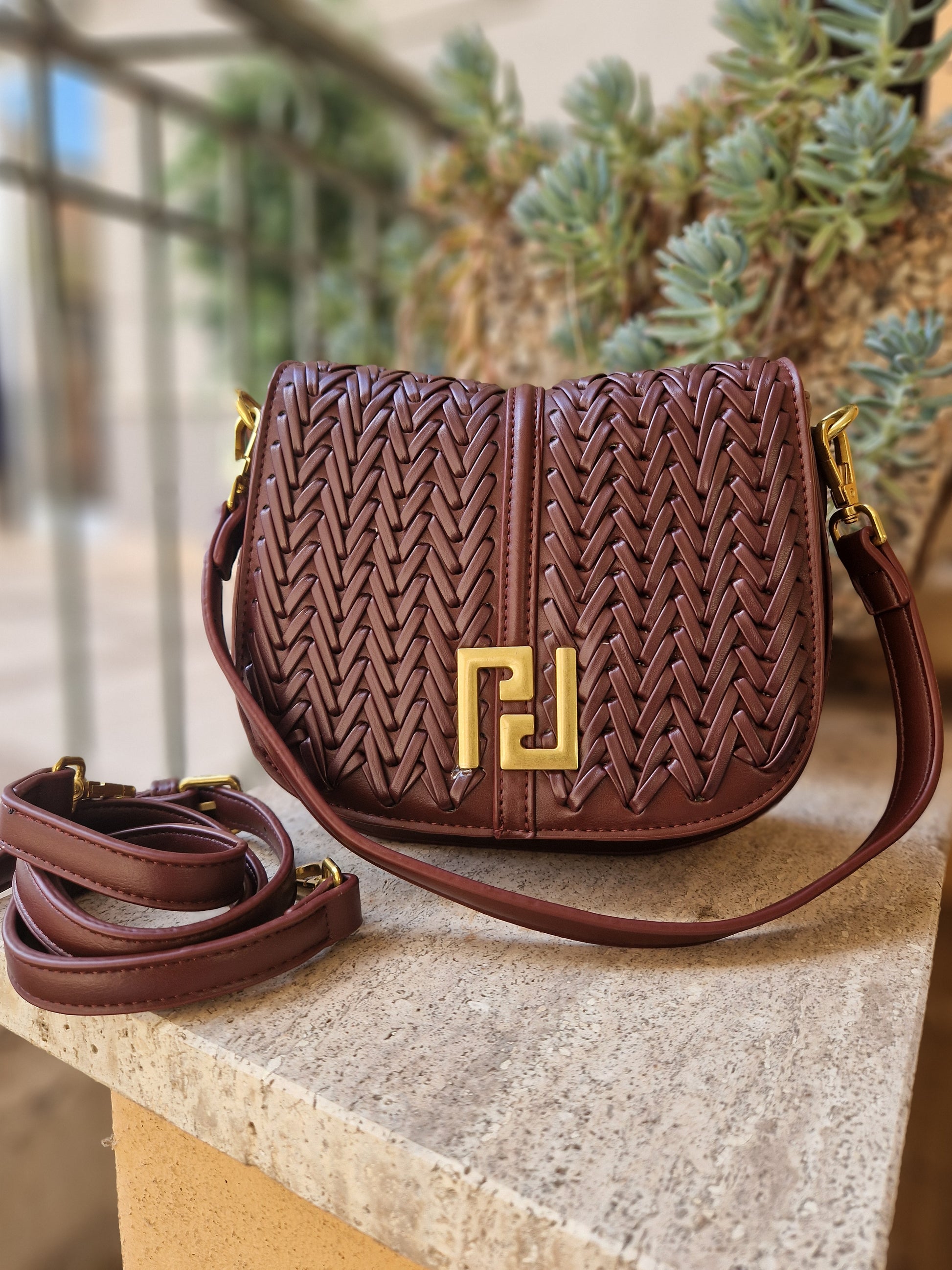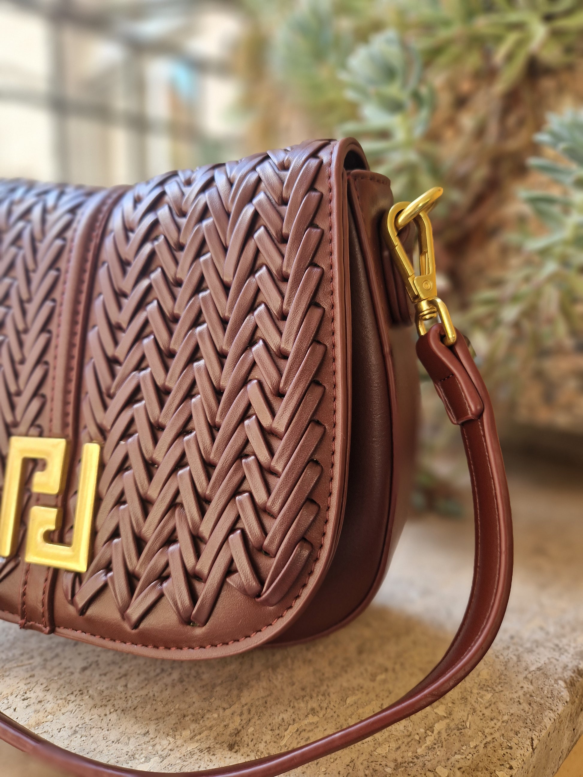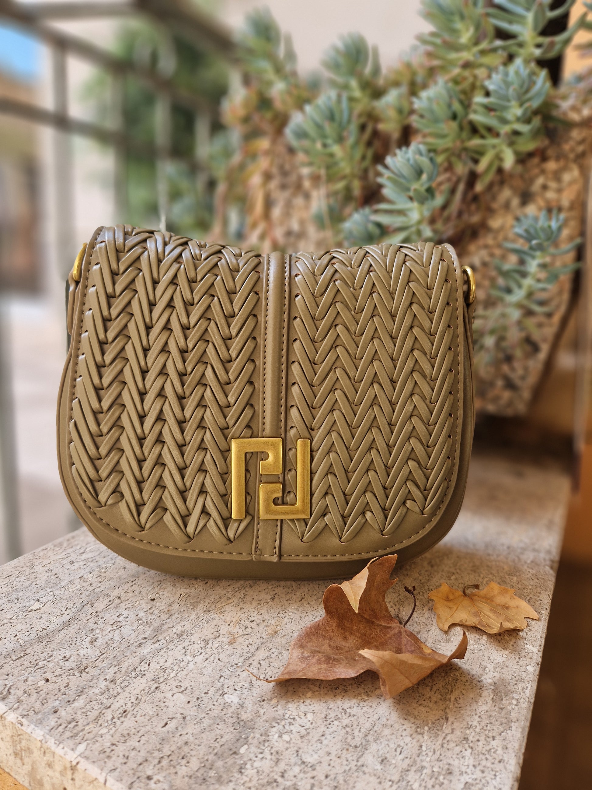 Borsetta con dettaglio intreccio sulla parte frontale, chiusura a clip con bottone calamita, zip interna
