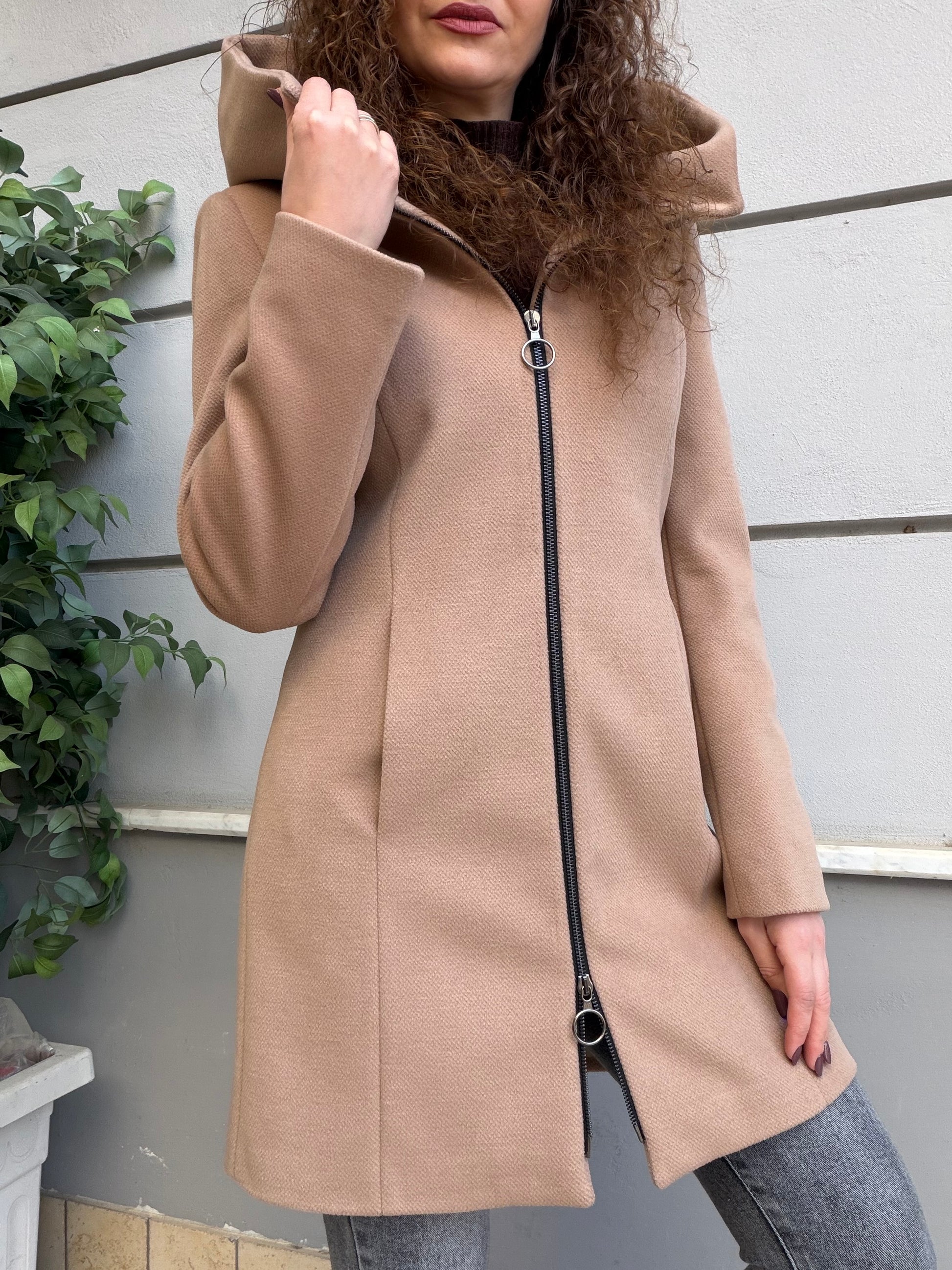 Cappotto slim con fodera interna, cappuccio non removibile. Chiusura frontale con zip
