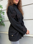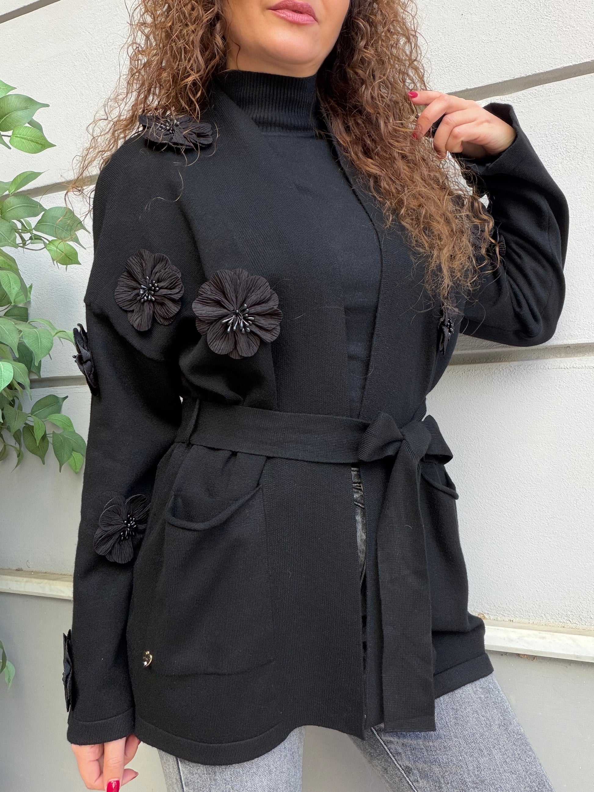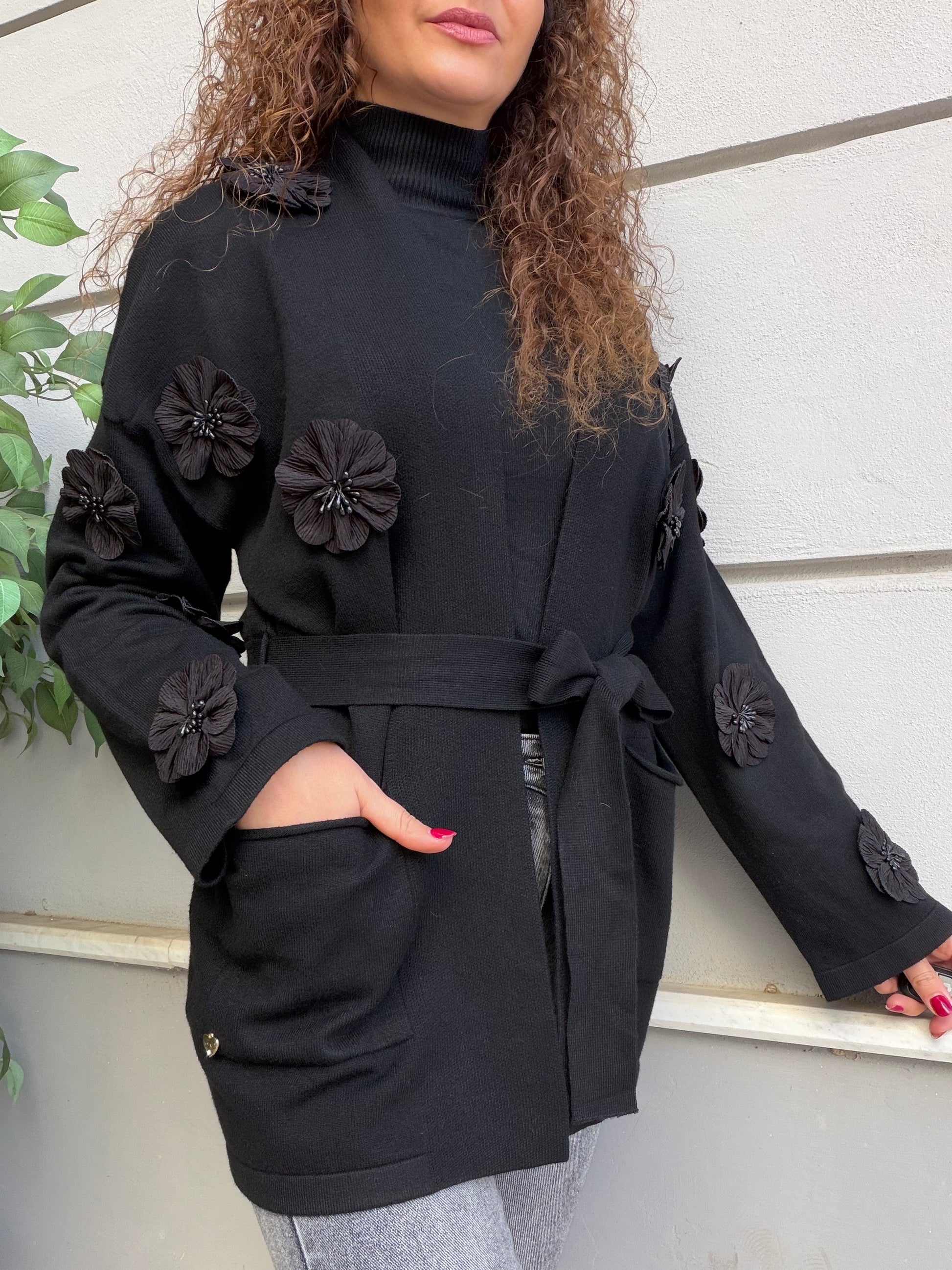 Cardigan lungo con tasche e cintura in vita, dettaglio fiori in 3d tono su tono applicati sulla parte frontale