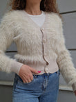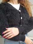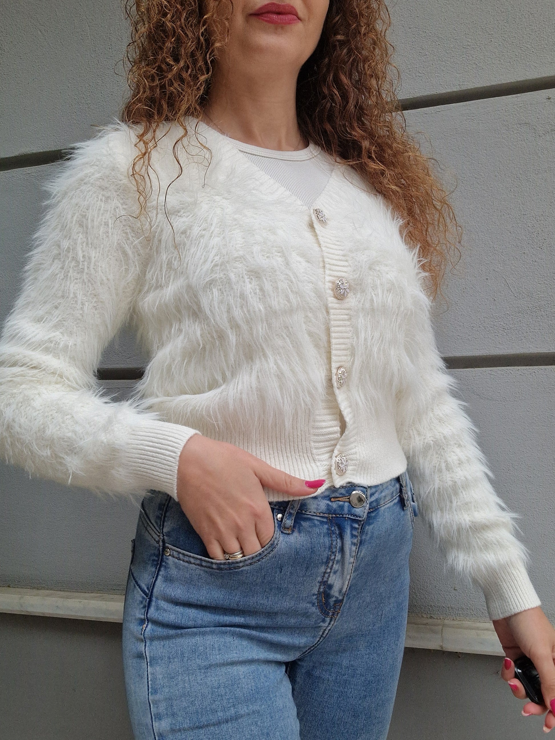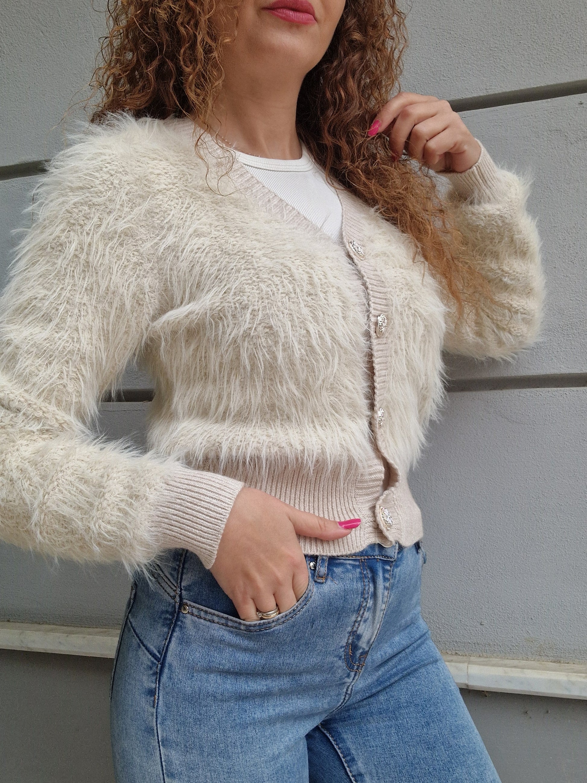 Morbidissimo cardigan pelosetto con bottoni gioiello scollo a V, Manica lunga.