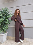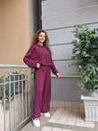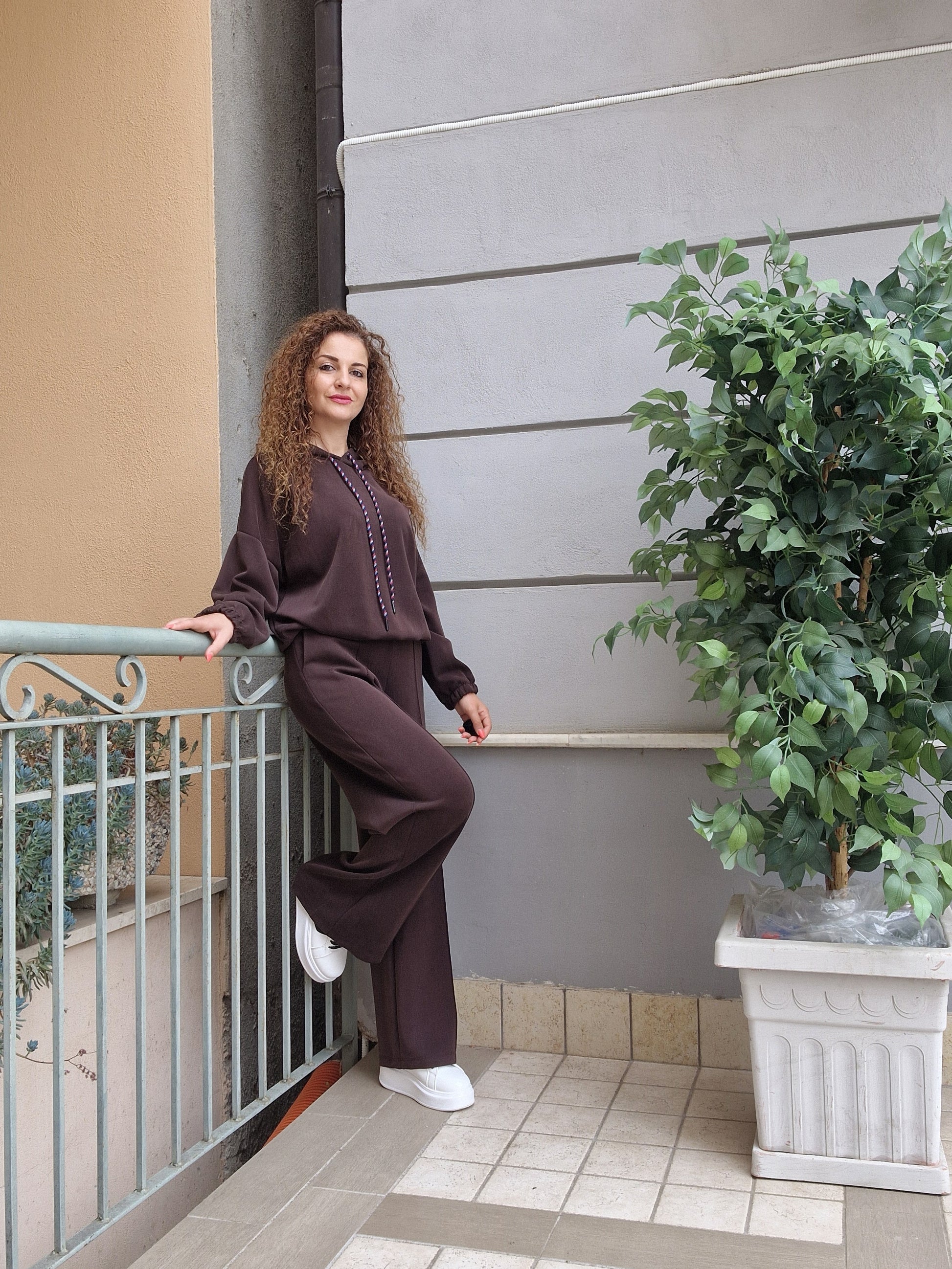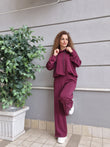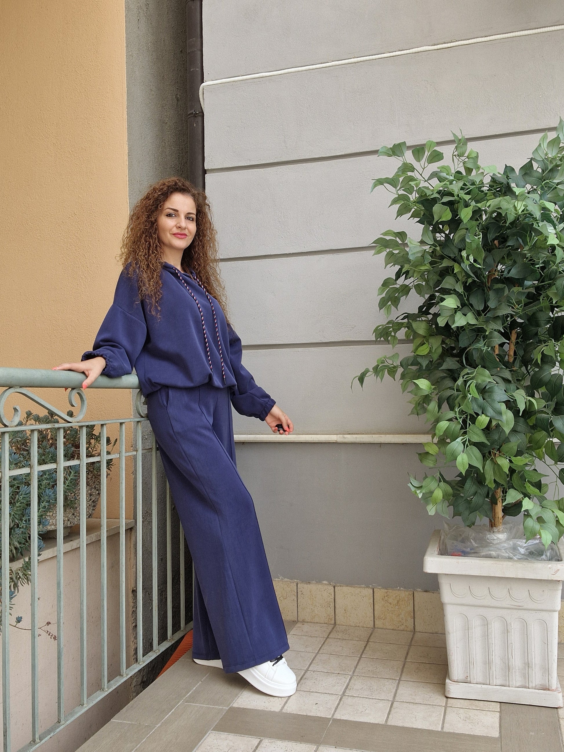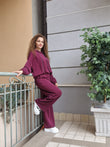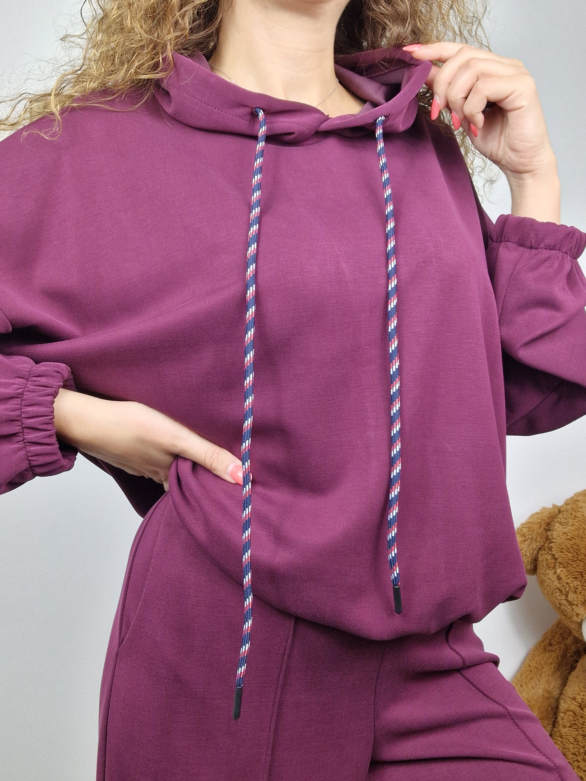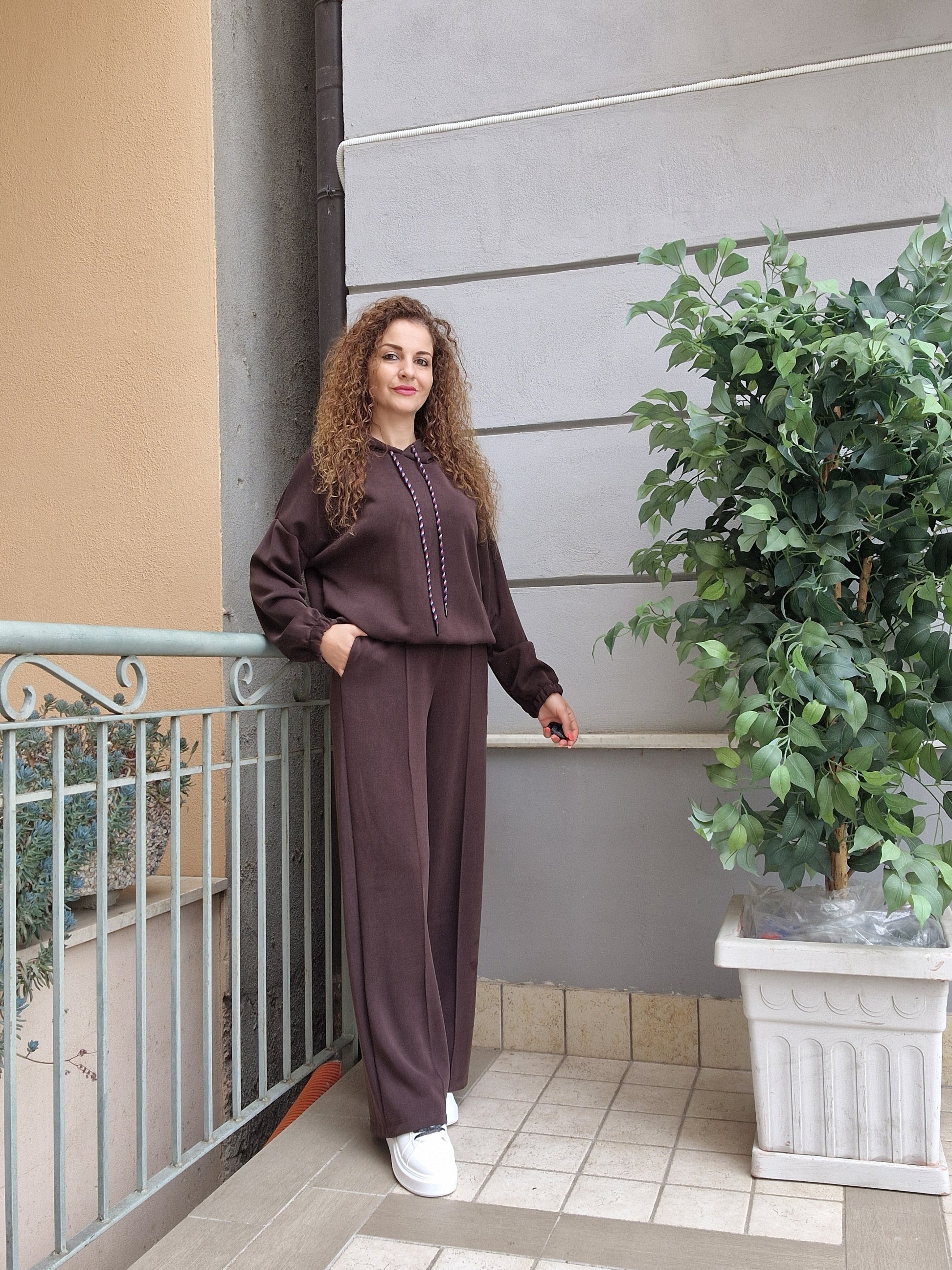 Completo tuta in morbida viscosa.Felpa oversize con cappuccio, elasticoal bordo.Pantalone a palazzo vita alta,comodo con elastico in vita.tasche davanti