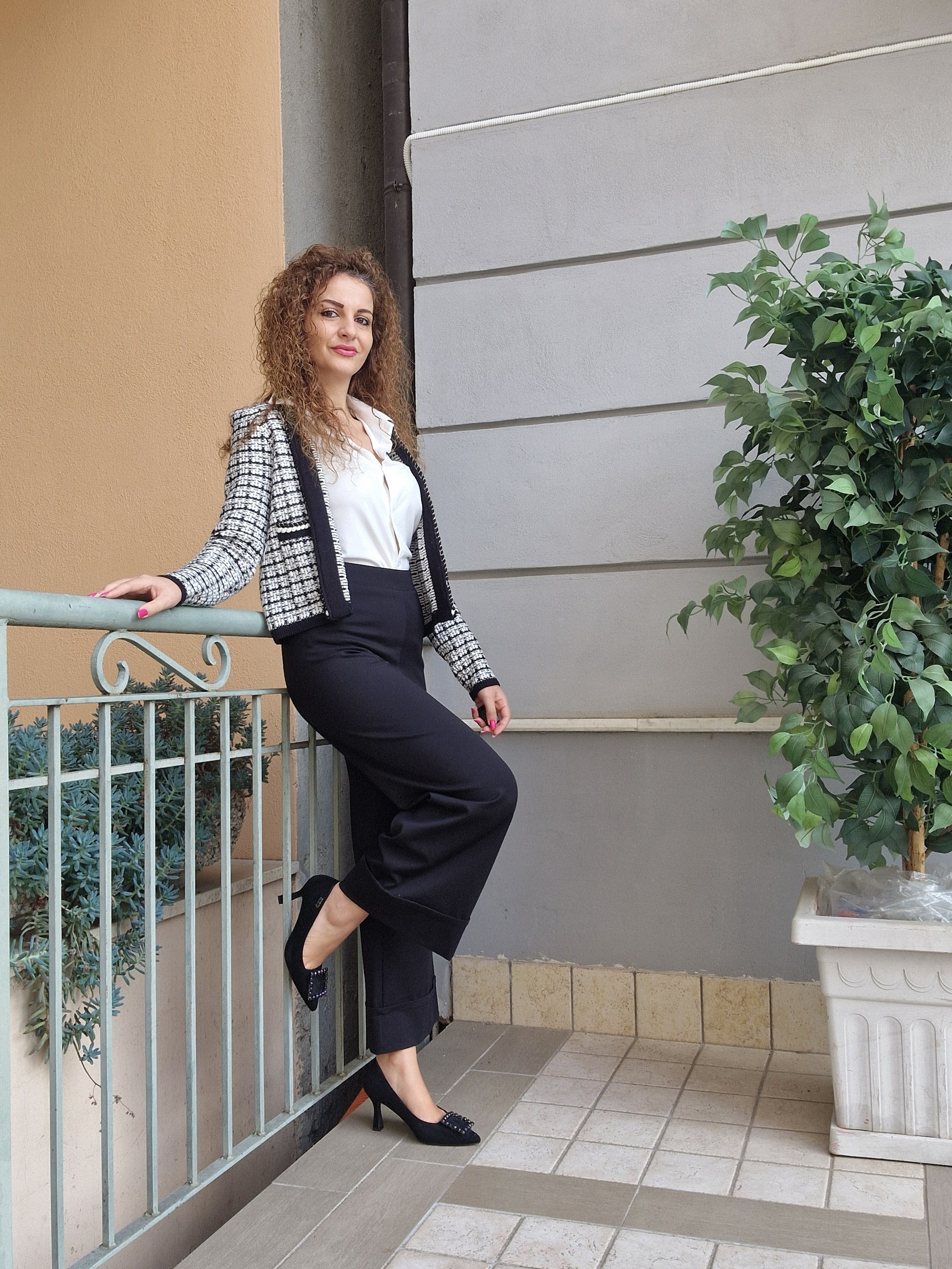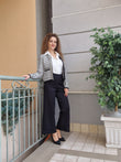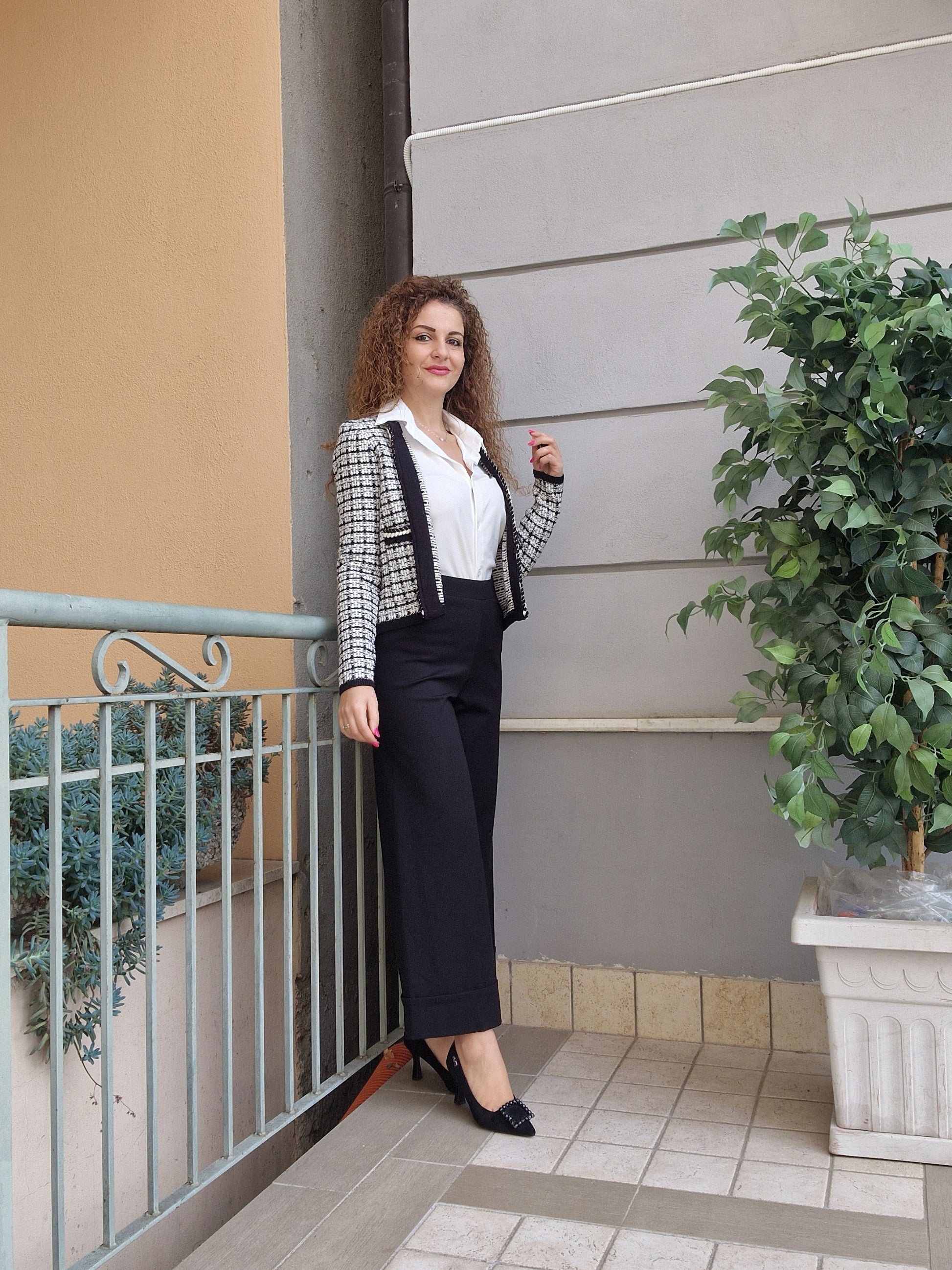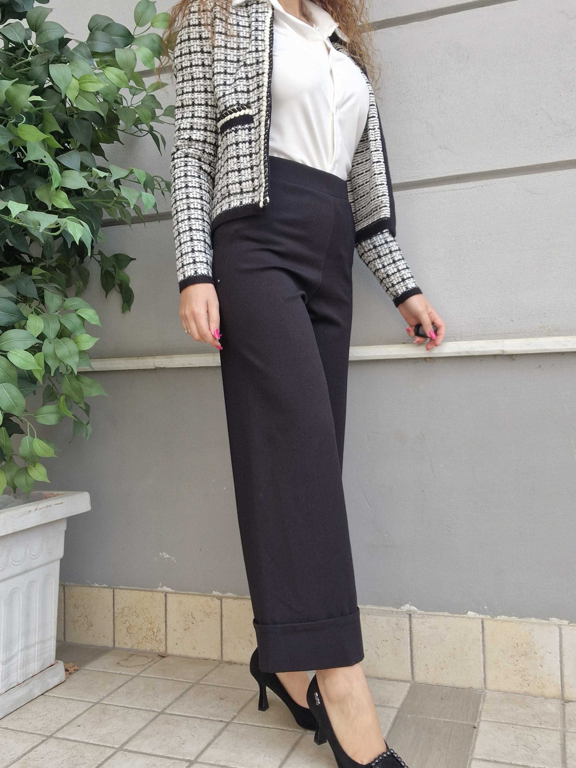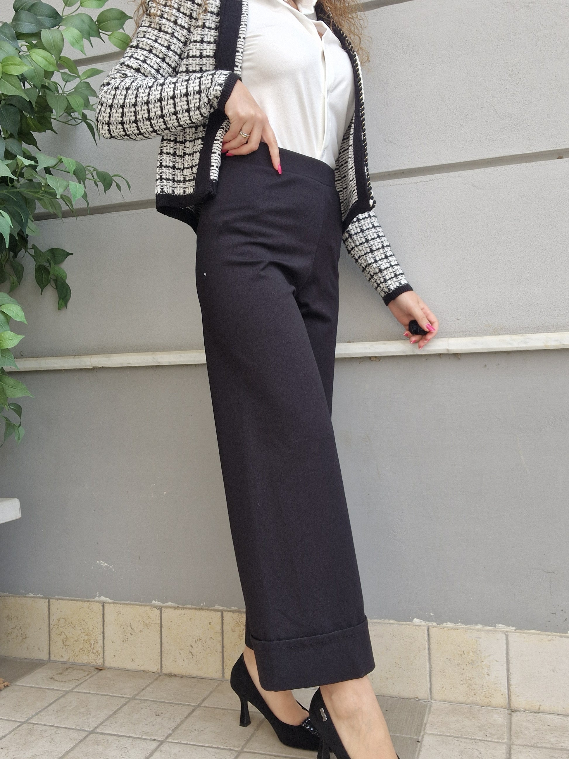 Pantalone gamba larga nero con fascia elastica in vita, dettaglio risvolto sul fondo cucito.