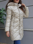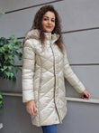 Giubbino donna con cappuccio ed ecopelliccia beige. Vestibilità slim.