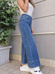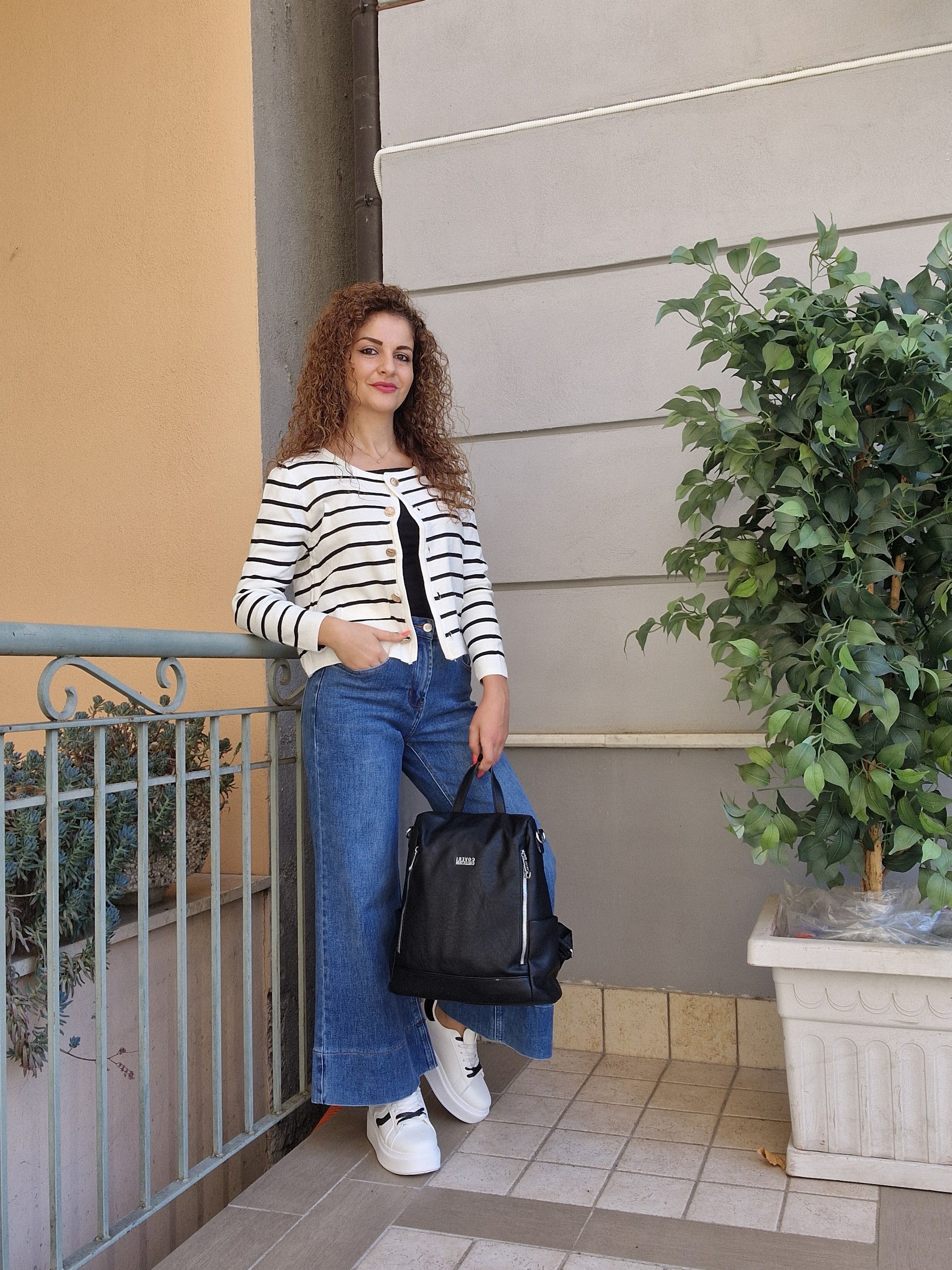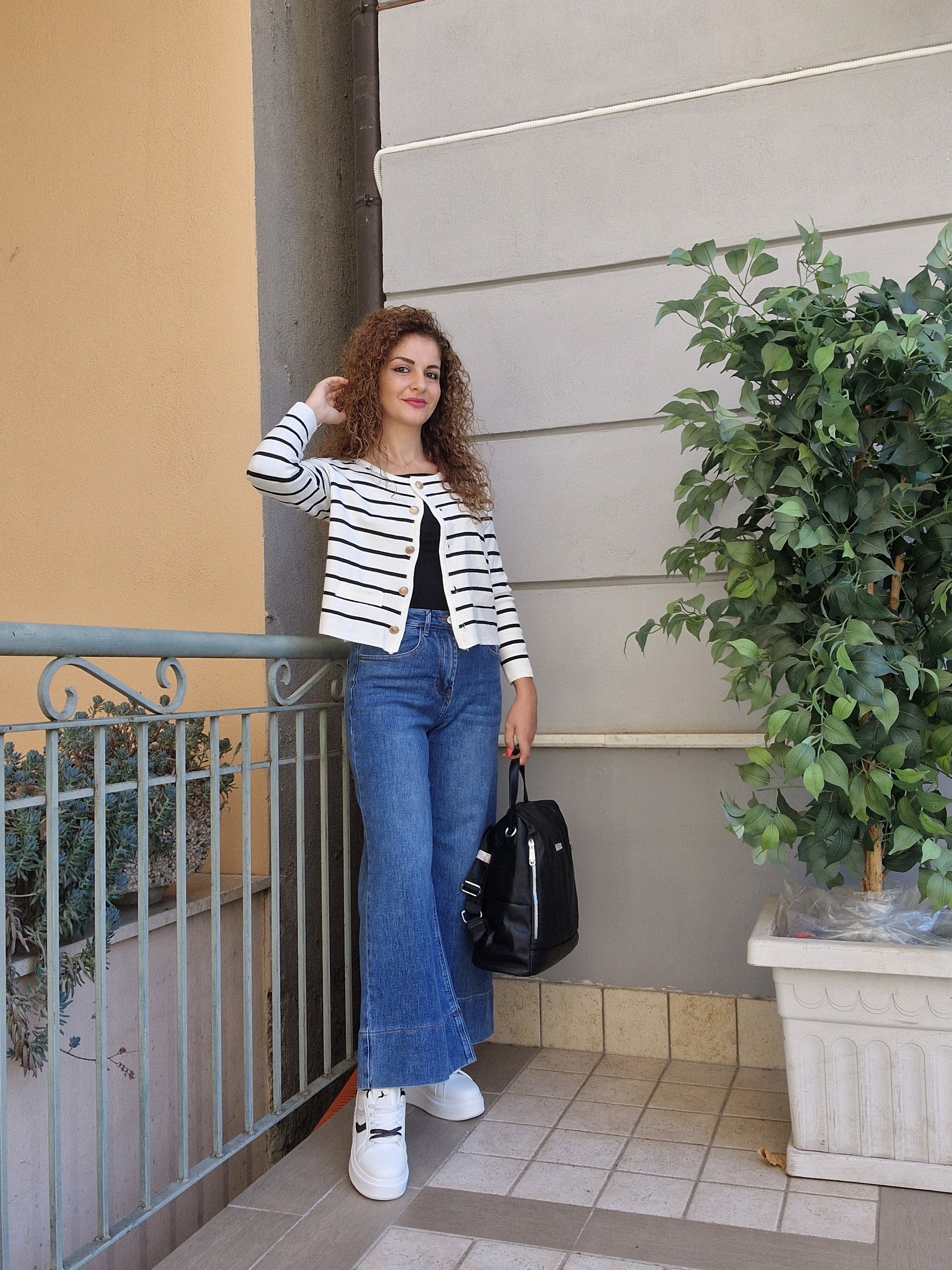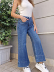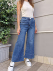Jeans gamba larga a vita alta modello capri.Chiusura con cerniera e bottone metallico. Passanti per cintura, tasche anteriori e posteriori