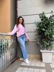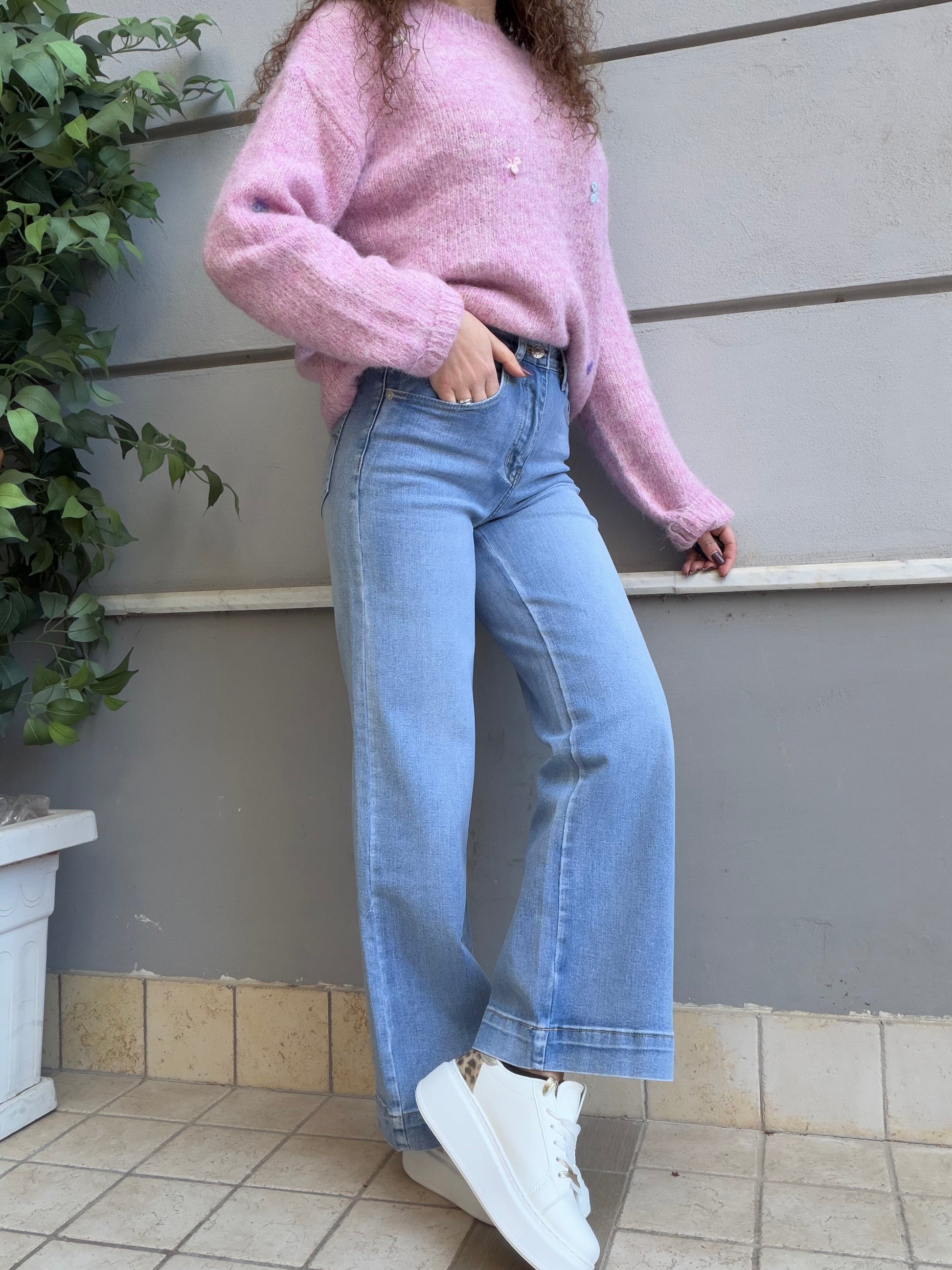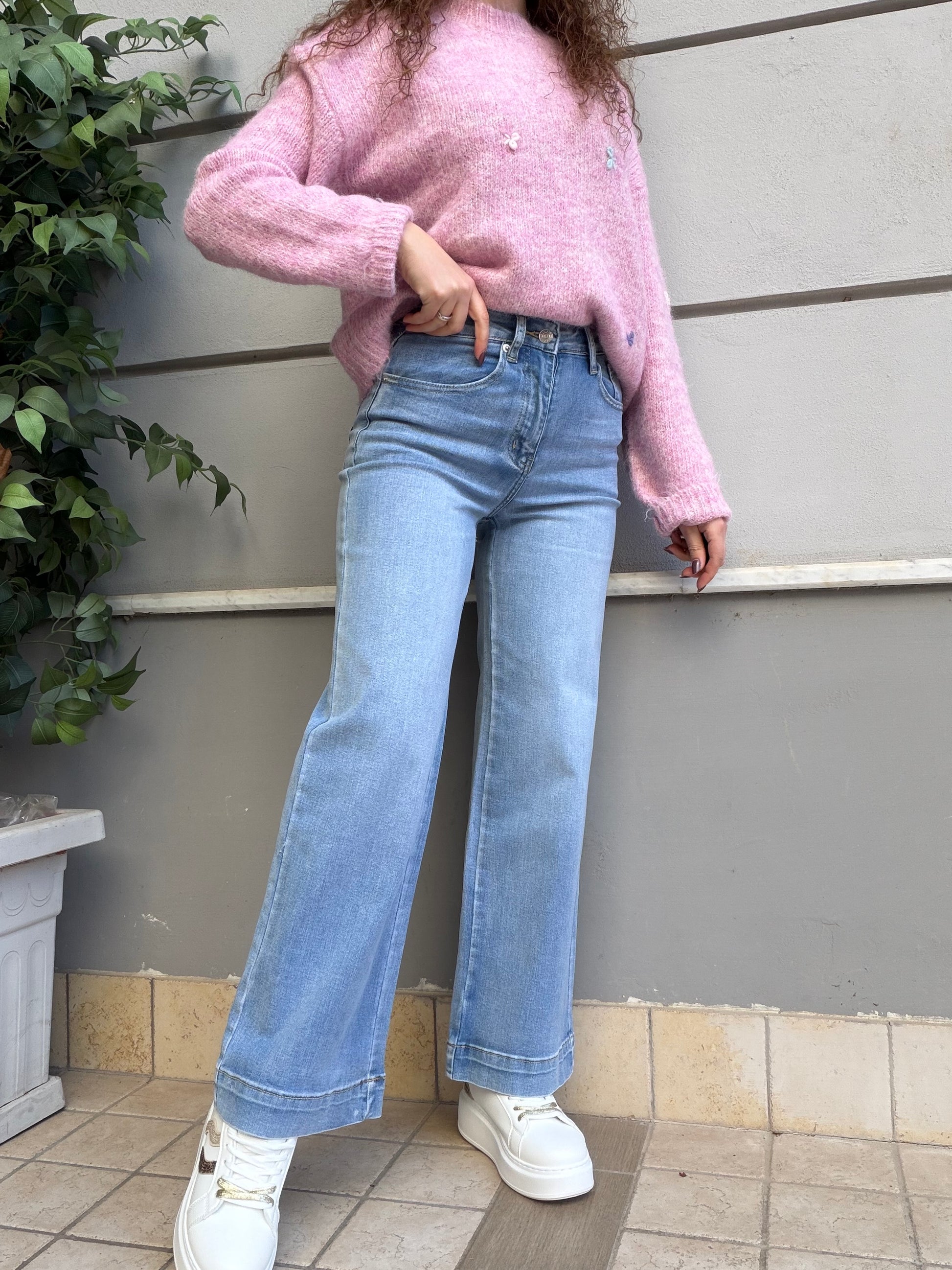 Jeans gamba larga a vita alta modello capri.Chiusura con cerniera e bottone metallico. Passanti per cintura, tasche anteriori e posteriori