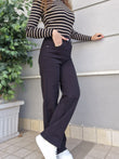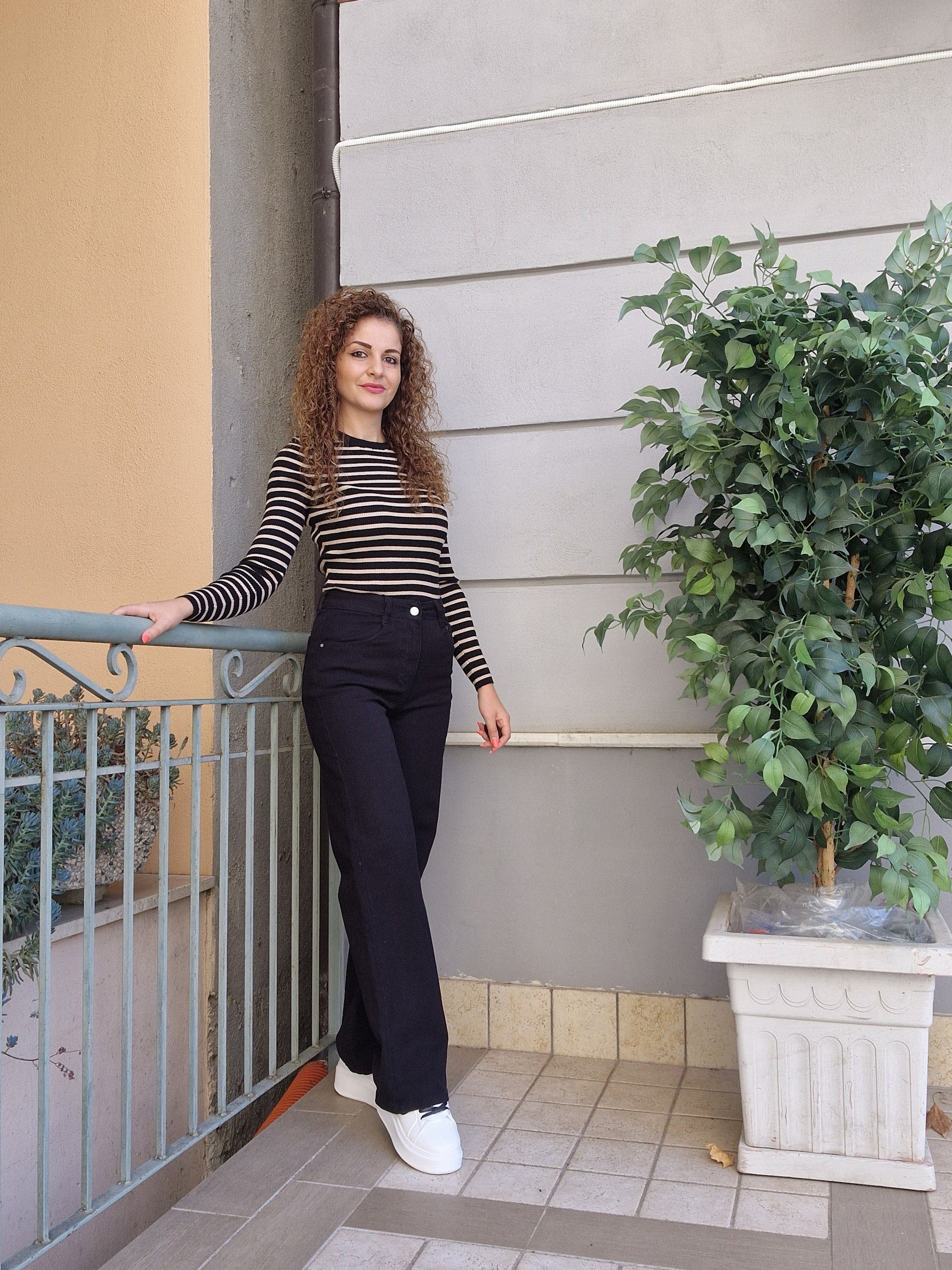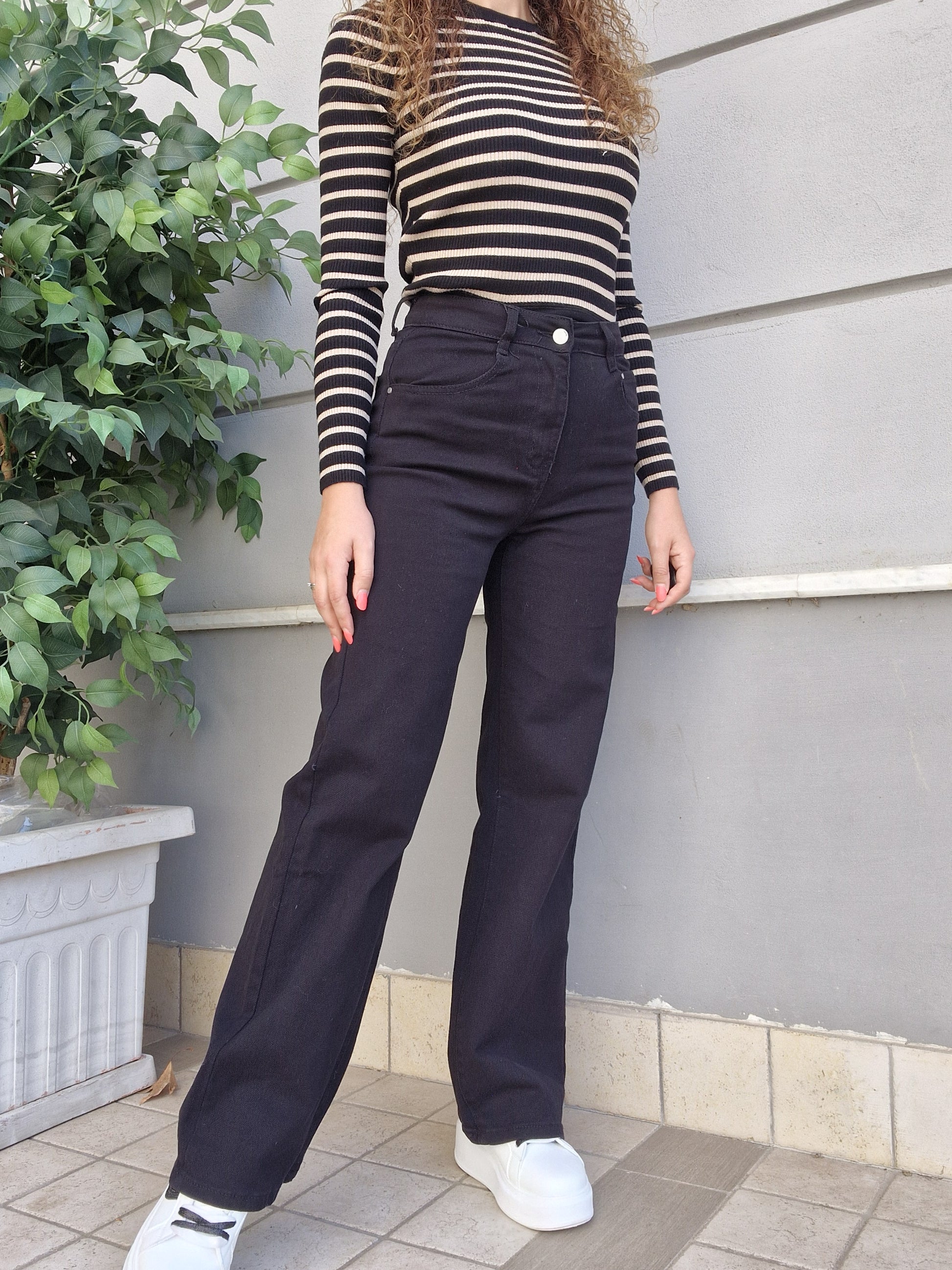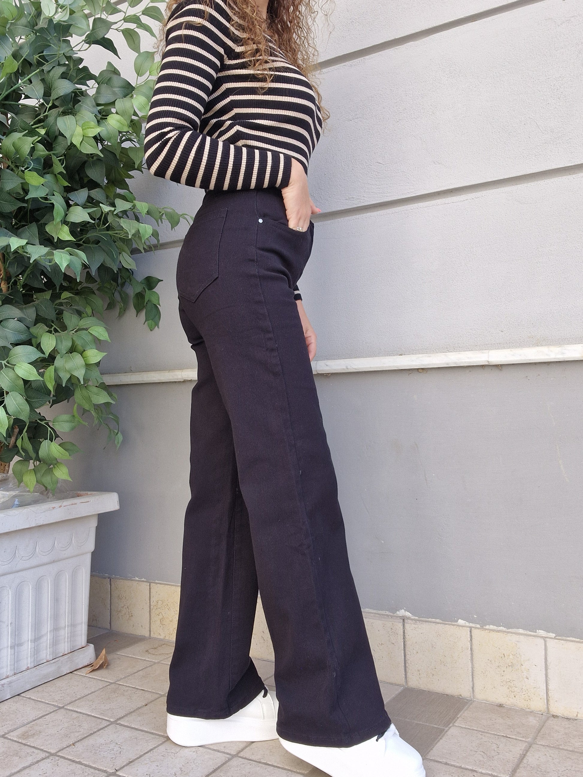 Pantalone palazzo in cotone colore Nero, vita alta elasticizzato.Chiusura con zip, tasche anteriori e posteriori, passanti per cintura